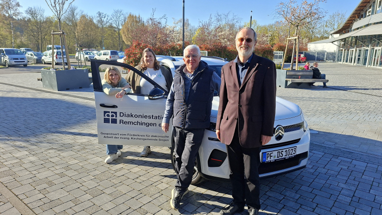 Eine wertvolle Unterstützung für die Arbeit der Remchinger Diakoniestation überbrachte dieser Tage Pfarrer Rudolf Kaltenbach als Vertreter des Singener Förderkreises für diakonische Arbeit: Der Förderkreis übernimmt für vier Jahre die Fahrzeug-Leasingraten für ein neues E-Fahrzeug und damit Kosten in Höhe von rund 10.000 Euro. „Wir schätzen die großartige Arbeit unserer Diakoniest ...