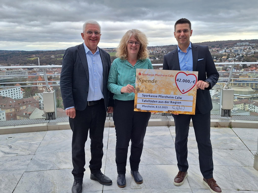 Mit Spannung erwarten wir als Diakoniestation zum Ende des Jahres die Einladung zur Spendenübergabe durch die Sparkasse Pforzheim Calw. Auch in diesem Jahr wurde wir nicht enttäuscht und am Montag fand die fast schon „traditionelle“ Spendenübergabe in der Skylounge des Sparkassenturmes statt. Unter dem Motto „Die Weihnachtszeit rückt immer näher – ein Moment, in dem das Licht der Hoffnung besonders stark leuchtet“, übergab Vorstandsmitglied Vincenzo Giuliano von der Sparkasse Pforzheim Calw insgesamt 42.000 Euro an die Vertretenden von zehn Tafelläden in der Region. Während seiner Rede in der Skylounge wies Giuliano darauf hin, dass es auch in der Region zahlreiche Menschen gebe, die auf Hilfe angewiesen sind. Gerade deshalb wolle die Sparkasse - wie auch in den Vorjahren – als Zeichen ihrer Solidarität Tafelläden und Sozialkaufhäuser unterstützen. „Gleichzeitig sage ich herzlich Danke für Ihr vielfältiges ehrenamtliches Engagement. Ihr unermüdlicher Einsatz ist ein Geschenk. Machen Sie weiter so – Sie verändern Leben, Sie schenken Hoffnung“, wandte sich der Sparkassendirektor an die Vertreterinnen und Vertreter der Einrichtungen. Vorsitzender Karl-Heinz Stengel von der Diakoniestation dankte im Namen aller Tafelläden und Sozialkaufhäuser den Verantwortlichen der Sparkasse Pforzheim Calw für die überaus großzügige Spendensumme die bei allen Einrichtungen benötigt wird und große Freude und Dankbarkeit auslöst. Die Diakoniestation Remchingen erhielt für ihre Tafelarbeit einen hohen Spendenanteil von 6.000 €. Eine Spendensumme die mithilft, die aktuelle Unterdeckung in der Tafelarbeit auszugleichen.