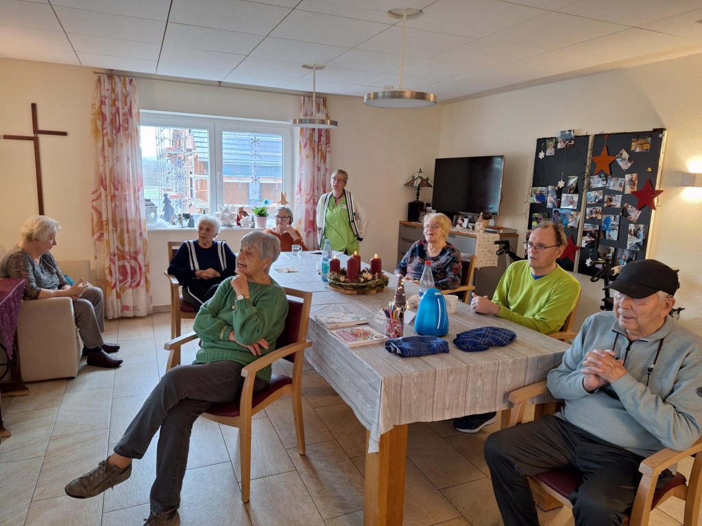 Groß war die Freude am 3. Advent, als die Sängerinnen und Sänger des Liederkranzes Nöttingen einmal mehr zu Besuch im Haus Brunnhälden eintrafen. Im Wintergarten nahmen sie Aufstellung und erfreuten die Bewohnerinnen und Bewohner mit Advents- und Weihnachtsliedern. Auch gemeinsam wurde gesungen. Für die Bewohner und Mitarbeitende ist es immer wieder ein besonderes Erlebnis und eine große Freude, wenn der Liederkranz unter Leitung von Florian Hartmann sie mit wunderschönen Liedern erfreut.